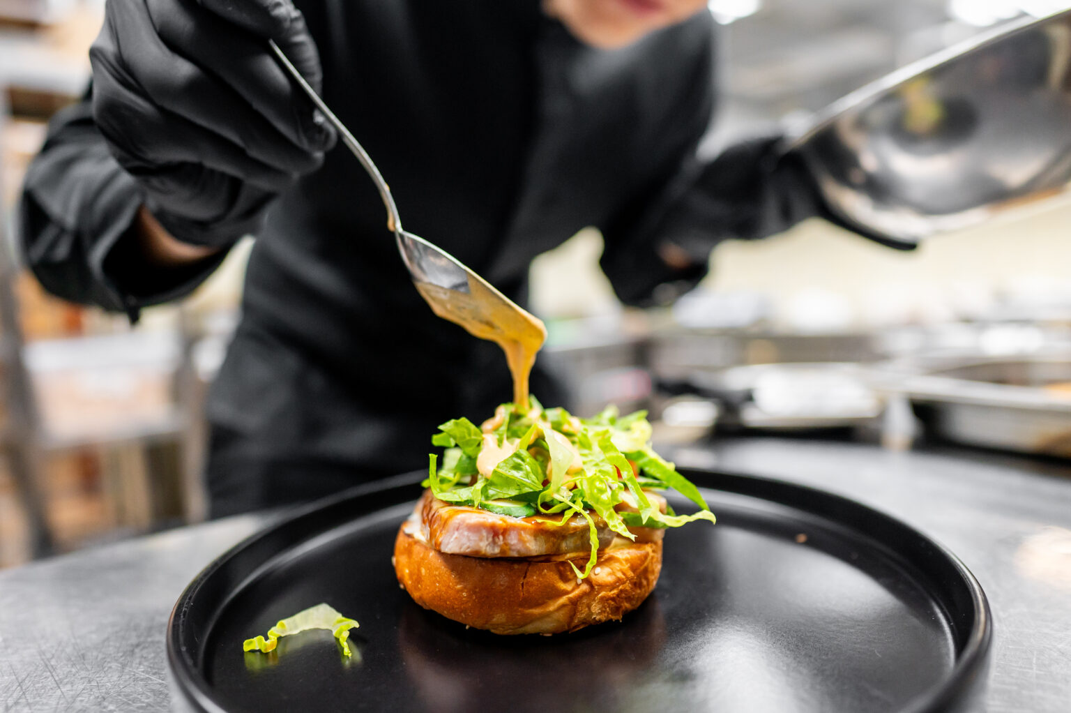 A professional chef garnishing a gourmet dish with sauce in a modern kitchen